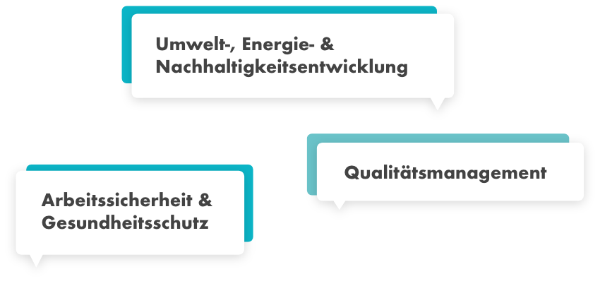 • Umweltschutz : ISO 14001 / ISO 50001 / EMAS • Arbeitssicherheit : ISO 45001 / SCC • Brandschutz : VDS 2009